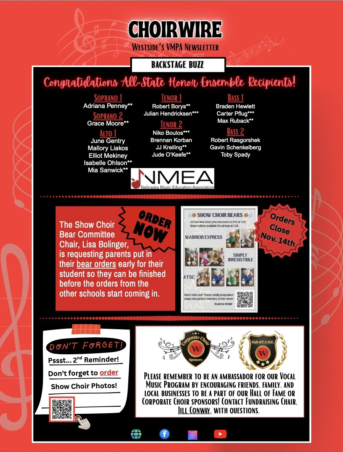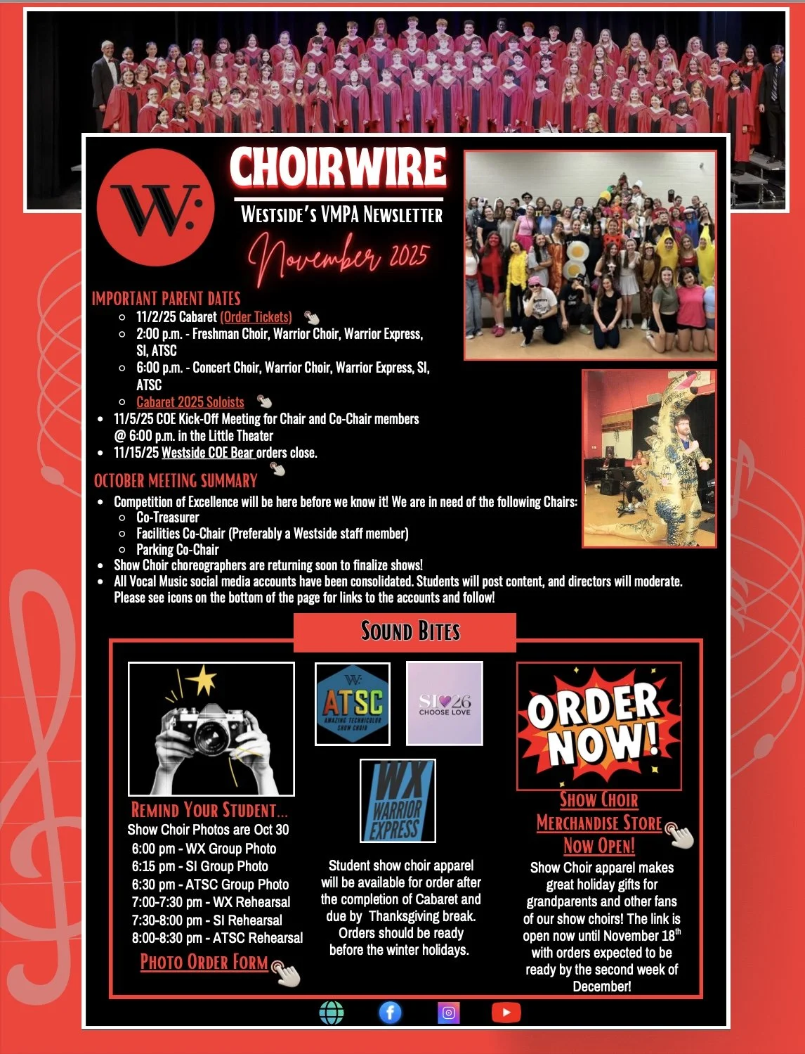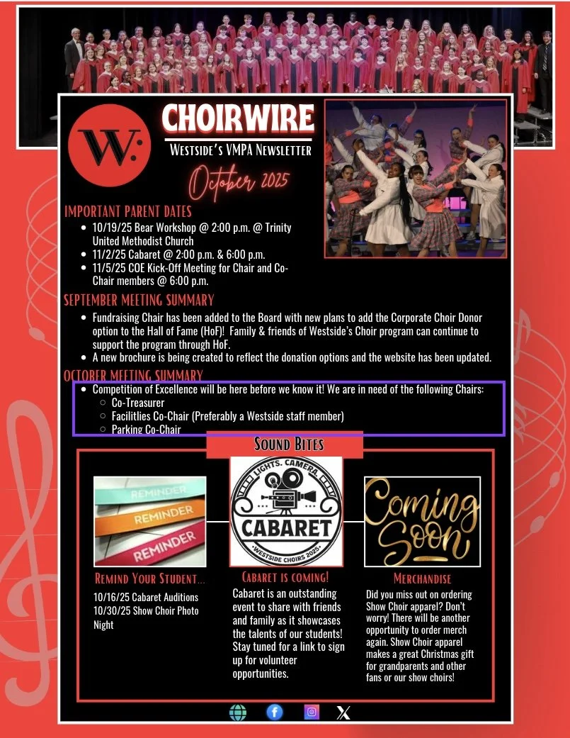 My personal goal for this year is to help make https://www.westsidechoirs.com/ the hub for all things Westside Choirs. It’s a work in progress! I hope to see you show choir parents this Sunday at Show Choir and Sundaes at 2:30 pm in the gym. And I look forward to meeting all of you throughout the year and sharing in what I know will be another tremendous year for the vocal music program at Westside.