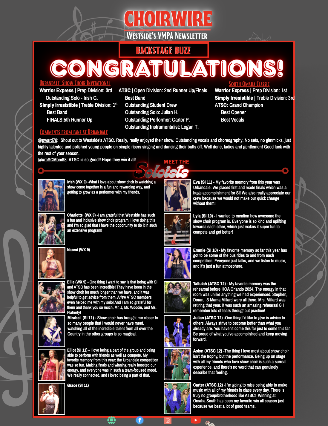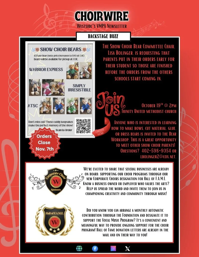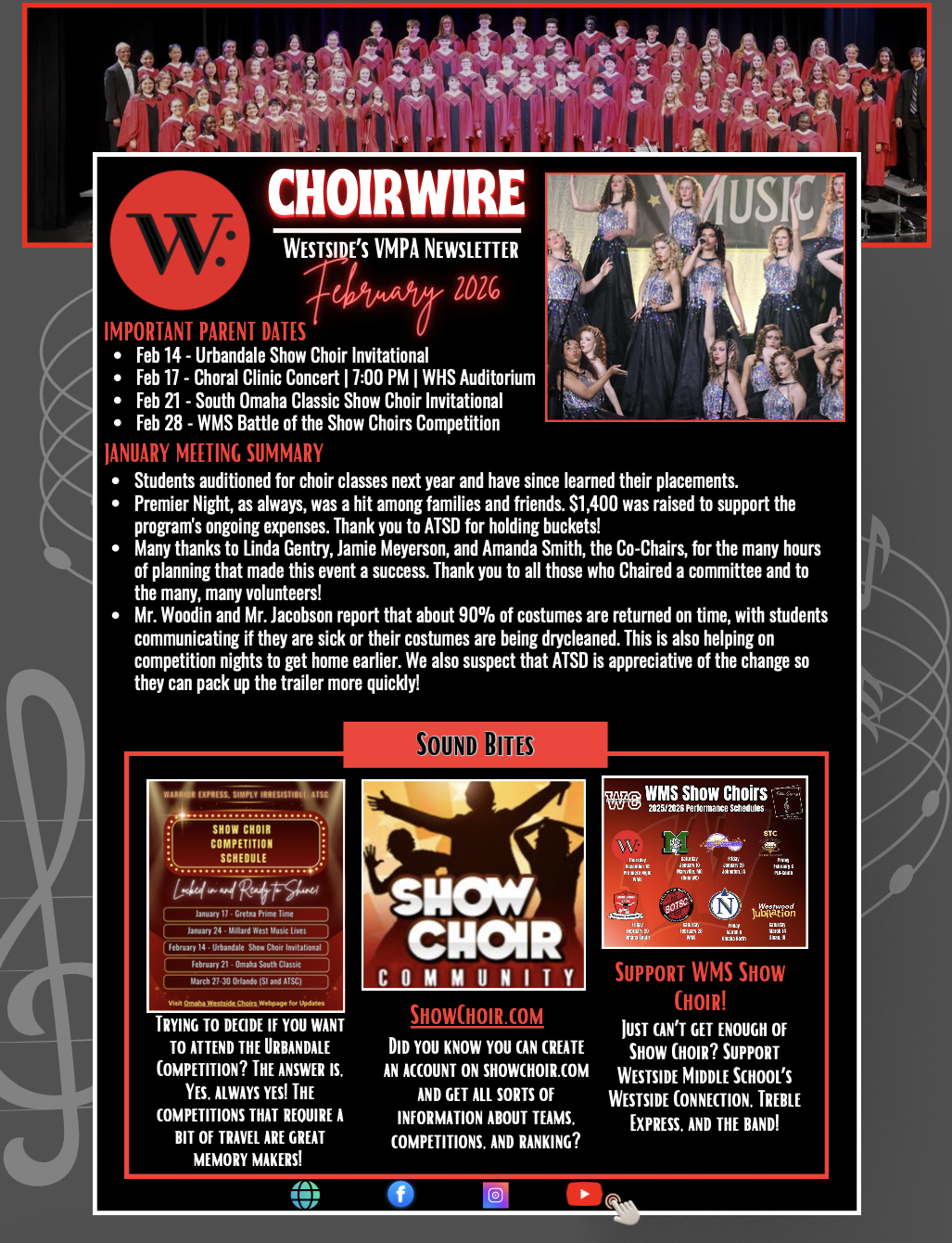 My personal goal for this year is to help make https://www.westsidechoirs.com/ the hub for all things Westside Choirs. It’s a work in progress! I hope to see you show choir parents this Sunday at Show Choir and Sundaes at 2:30 pm in the gym. And I look forward to meeting all of you throughout the year and sharing in what I know will be another tremendous year for the vocal music program at Westside.