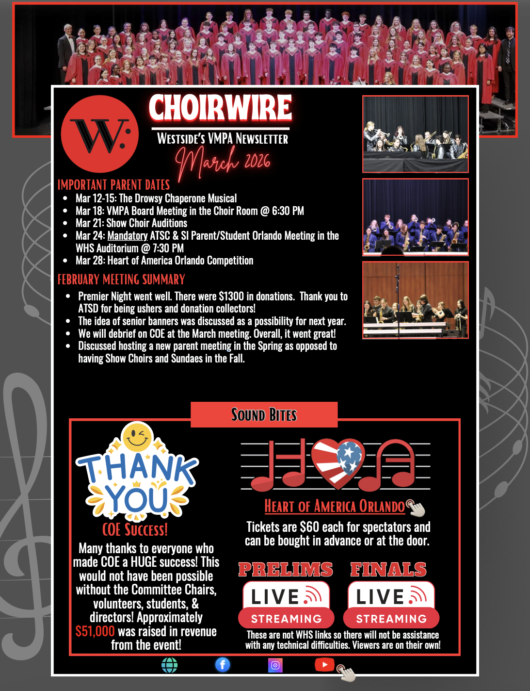 As the VMPA, our primary activities are to assist the directors in promoting and providing support for all choirs and show choirs at Westside. Throughout the year, we are tasked with providing assistance with rehearsals, concerts, team-building activities, and various fundraising initiatives. VMPA also provides financial support to the entire vocal music program.